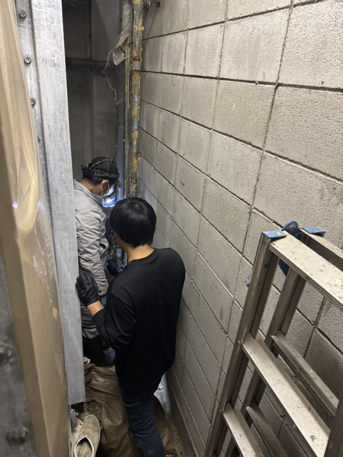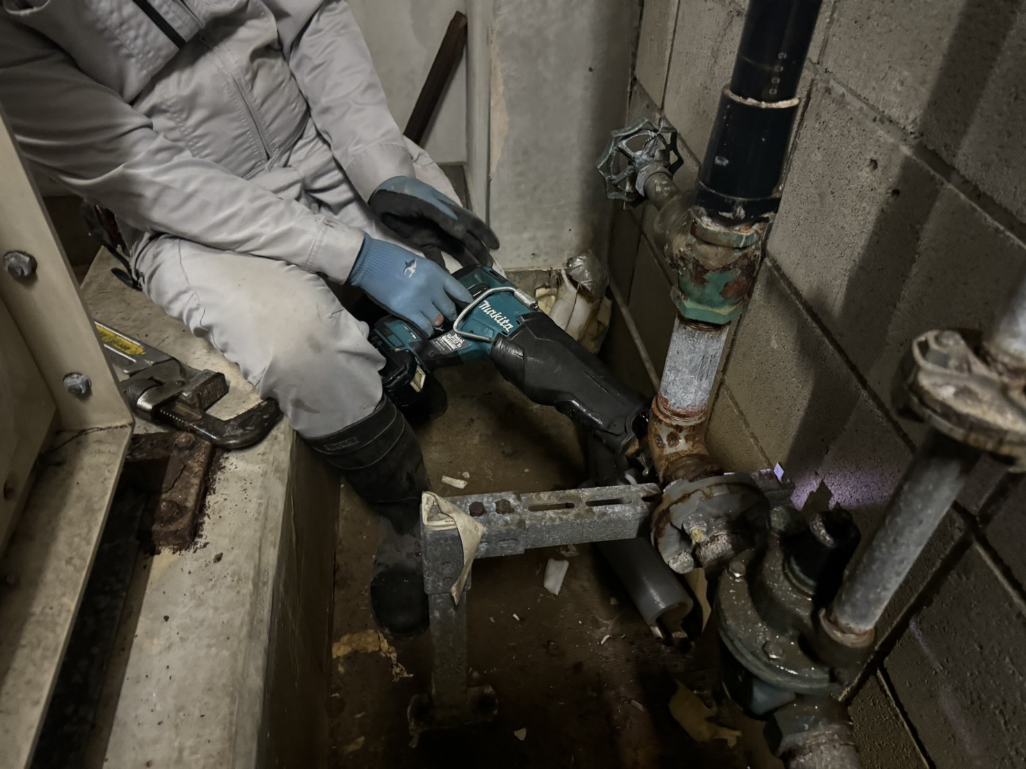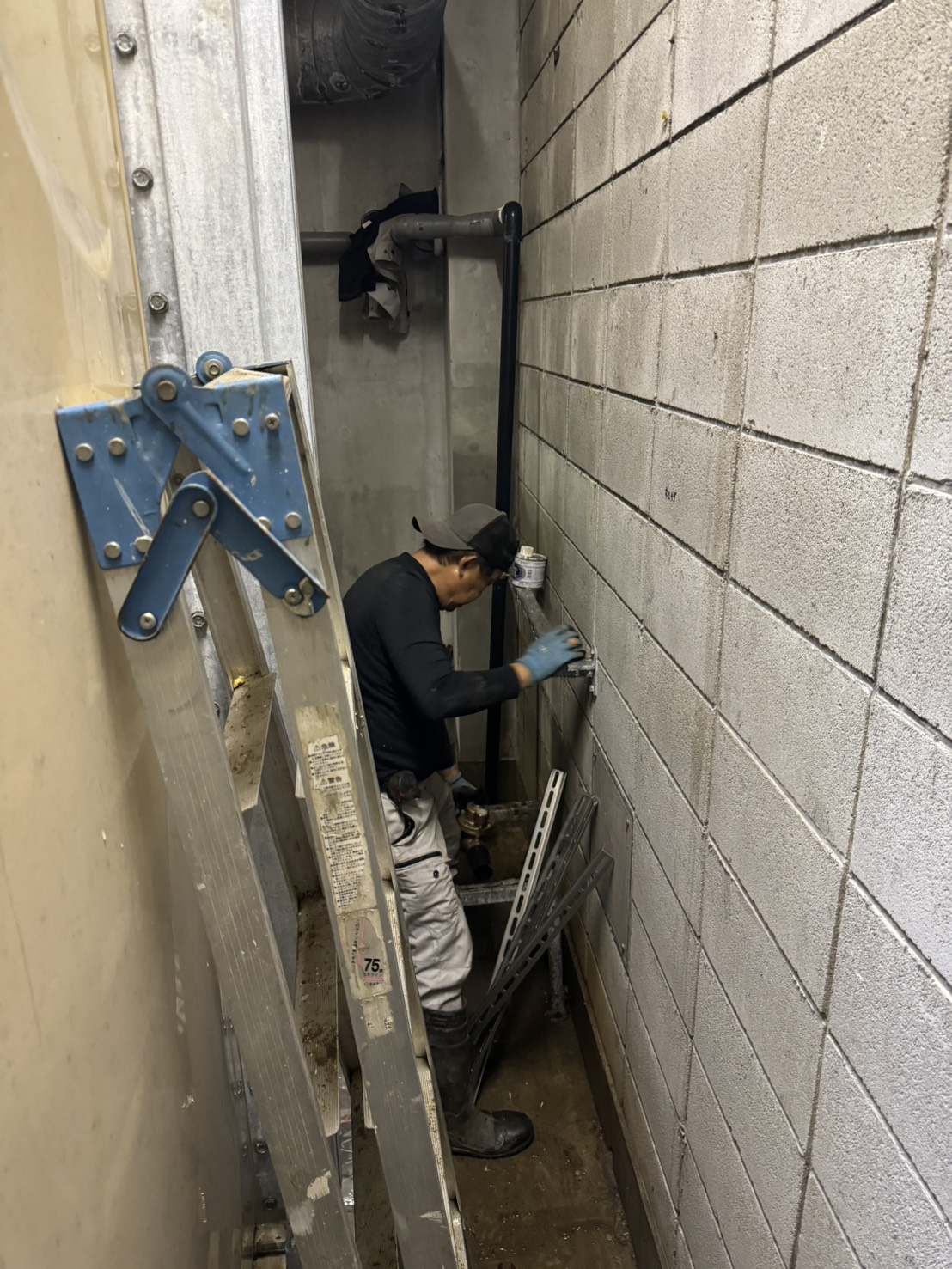 目視での確認が困難な地下ピット内にて、給水管の漏水を確認いたしました。